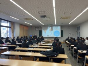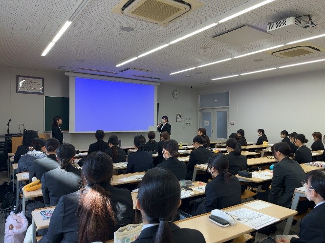 12月23日(火)に熊本県栄養士会の田上会長および石橋副会長が本学にお見えになり、栄養士会の活動と栄養士免許取得後のキャリアアップ支援について、講話をしていただきました。お二人は本学科の卒業生でもあります。