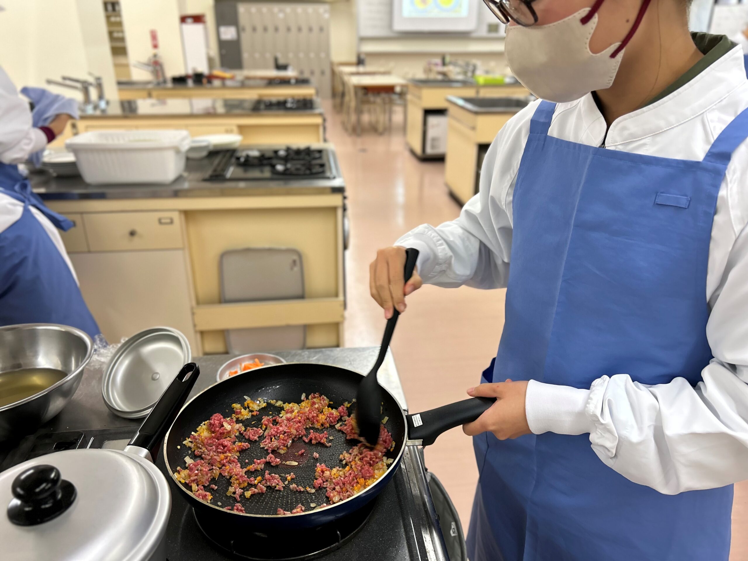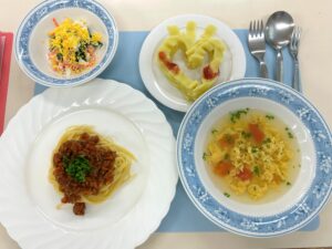 今回のメニューは「保育所給食」ということで、上述のライフステージでは「乳幼児期」がターゲットとなります。1,2歳の幼児が食べやすいようやわらかさなどに配慮することや、味覚を育てるため薄味にすること、見た目に楽しめる工夫を行うことなどを、調理実習を通して学びました。2年次には保育所での校外実習を控えており、さらに保育所への就職を希望する学生にとって、今回の実習は良い経験になったと思います。今後にぜひ生かされることを期待します!