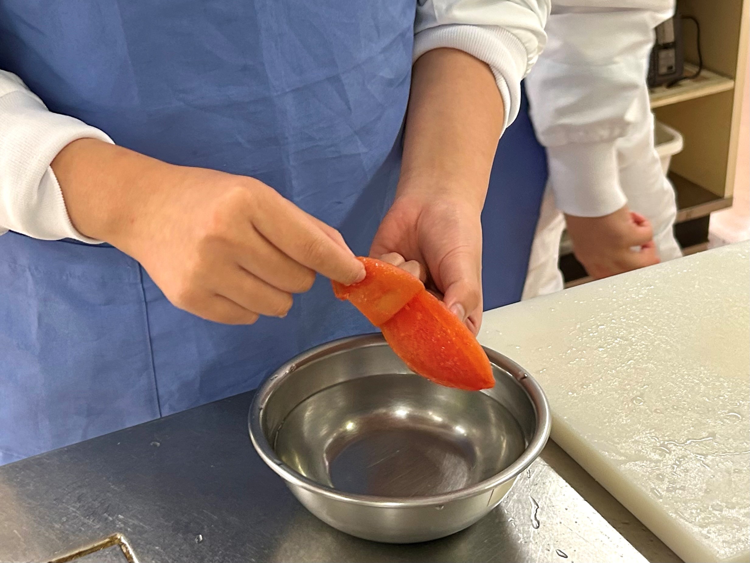 スープに使用するトマトの皮は湯剥きして、幼児期前期(1~2歳)の子どもに食べやすく調理します。