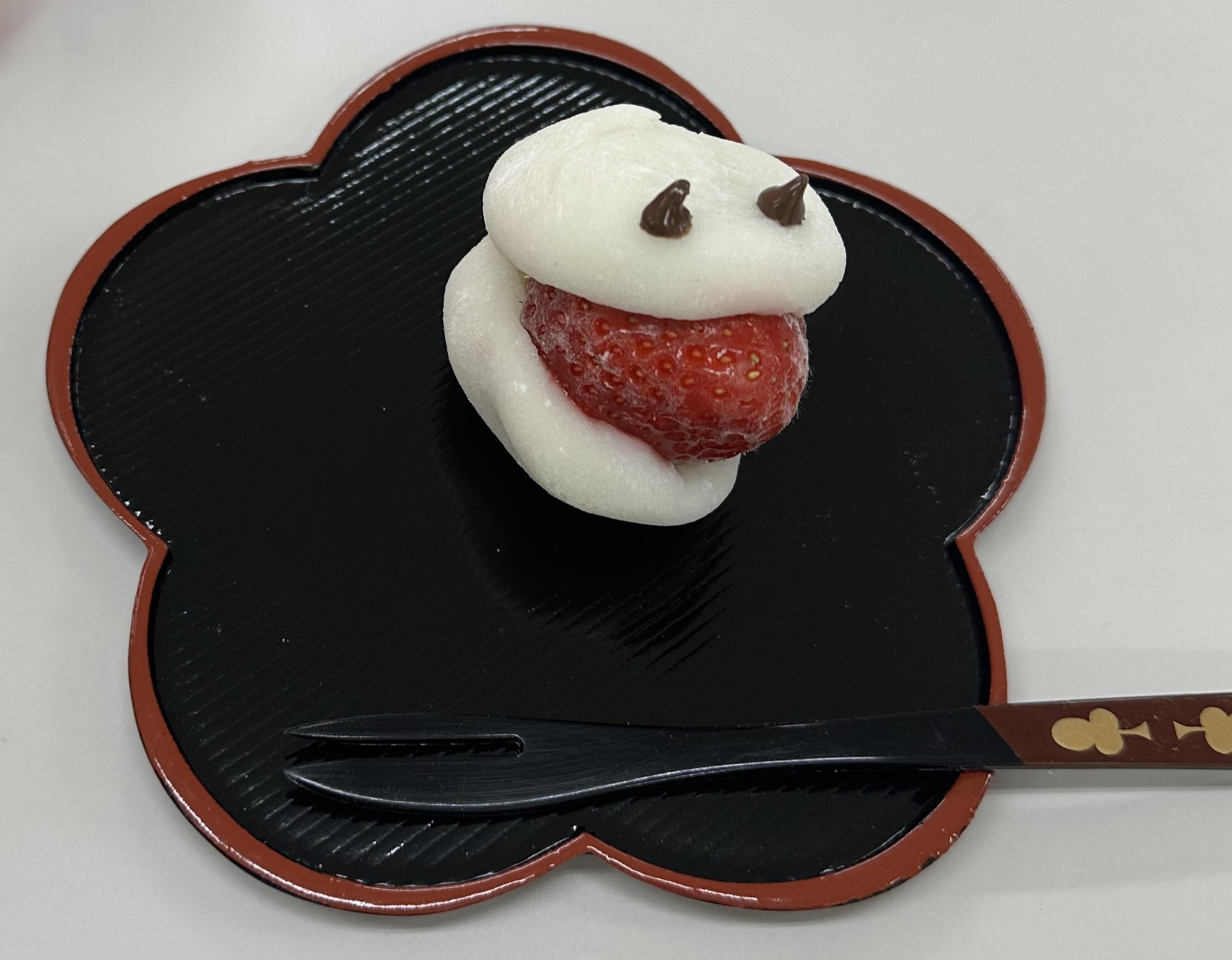 学科紹介に引き続いて、今回は模擬授業の一環として「米粉の科学~いちご大福作り体験~」というテーマで食品(いちご大福)製造の実習を体験してもらいました。最初に、本学科の教員が「米粉の科学」と題した米デンプン(米粉の性質や利用法など)に関する講義を実施しました。次に、この講義で説明された知見に基づいて、参加者に米粉を用いた「いちご大福作り」実習を実際に体験していただきました。実習の最中には、サポートとして参加した本学科の1年生(在学生)と楽しく会話する声も聞こえていました。