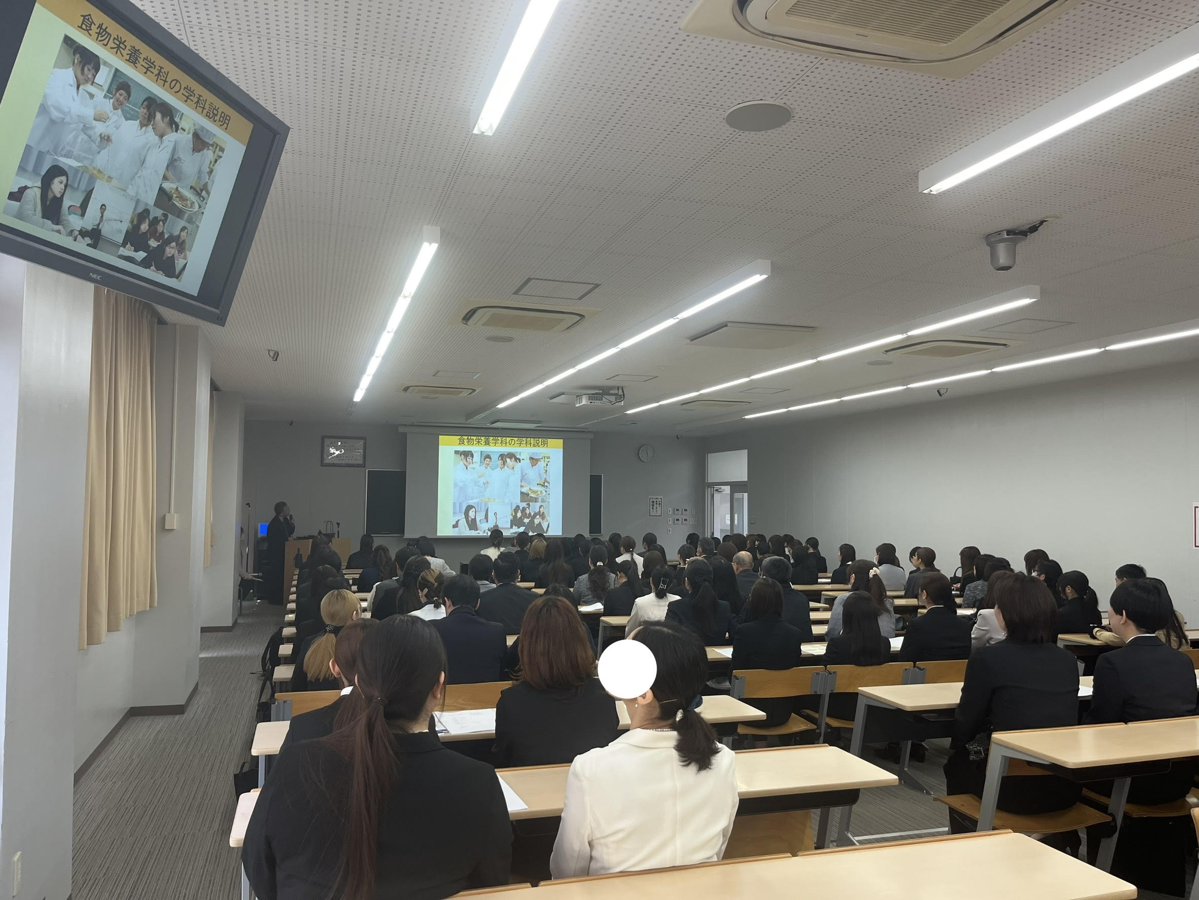 保護者説明会では、学科長挨拶を皮切りに、授業カリキュラム、栄養士免許に必須となる校外実習などについての説明を行いました。また、学科長から、本学科では学生、保護者と教員が三位一体となった連携を行うことによって、学生個々の目標実現に向けて取り組んでいくことも伝えられました。