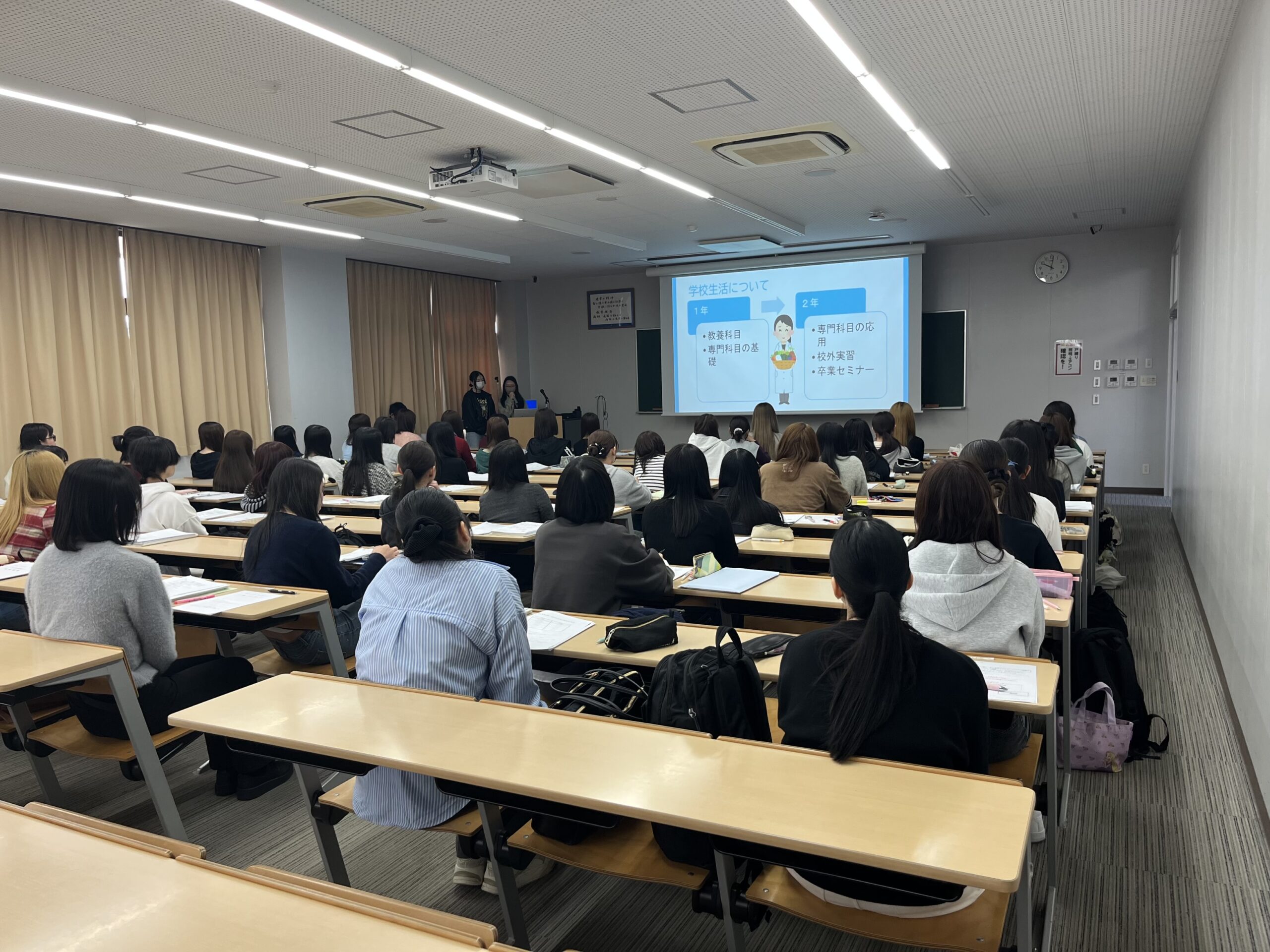 新入生オリエンテーションでは、学科の説明、履修計画や校外実習といった授業に関わる重要なポイントから学生生活全般に関することまで、幅広い内容について説明しました。さらに、食物栄養学科の2年生からは実体験に基づいた授業や学生生活に関するアドバイスが伝えられました。新入生は入学したばかりということで、不安も多いかと思いますが、先輩の話を聞くことで大学生活への期待も大きく膨らんだのではないでしょうか。