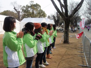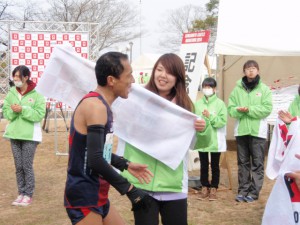 昨年同様、ゴール地点で完走者へのメダル授与およびタオル渡しを行いました。