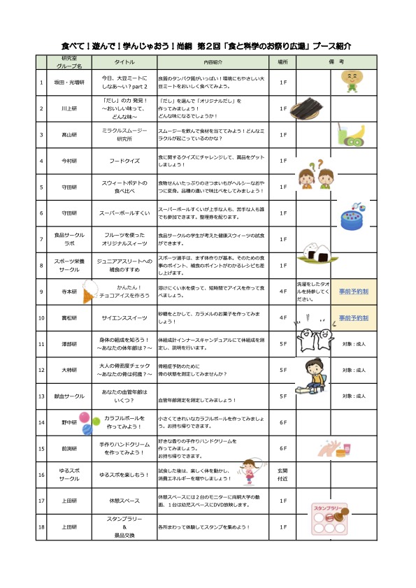 今年度も、小中学生の皆さんをはじめとして、どなたでも参加できる「食と健康を科学する楽しいお祭り」を行います。化学反応を利用したサイエンススイーツ作りや冷凍庫を使わないアイスクリーム作りにチャレンジしたり、体年齢や骨密度を測定したり、楽しい食育クイズやスランプラリーにチャレンジしたり、たくさんのブースを準備しています。