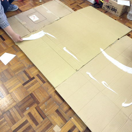まず、すべり台やままごと用のキッチンなど、これからの授業で制作する、少し大きめの遊具制作用のため、ダンボールを5~6枚分の厚みに貼り合せた、ダンボールパネルを作りました。ダンボールは「フルート」とよばれる波型の芯が入っている構造で強くなっているのですが、それが縦目、横目と交互になるように貼り合せていきます。接着剤は木工用ボンドを使用します。ゼミ生たちも、最初は恐る恐る木工用ボンドを塗っていましたが、最後の方は職人のようなヘラ使いでボンドを均一に伸ばしていました。最後は重しをして、乾燥させます。さて、これからどのような作品となるでしょうか。
