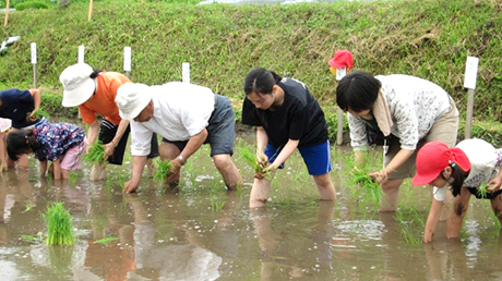 ![]() 苗の植え方を教わり、実際に練習してみました! | ![]() 学生たちも、親子の間に入って田植えに挑戦! |
