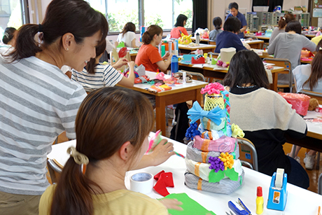 下は「造形表現」の講座で、廃材を利用した「わたしの帽子づくり」の制作風景です。それぞれの先生が、今まで保育者として培ってきた技術を存分に発揮しながら、そしてとても楽しく作っておられました。最後は素敵な帽子をかぶって全員で記念撮影をしました!