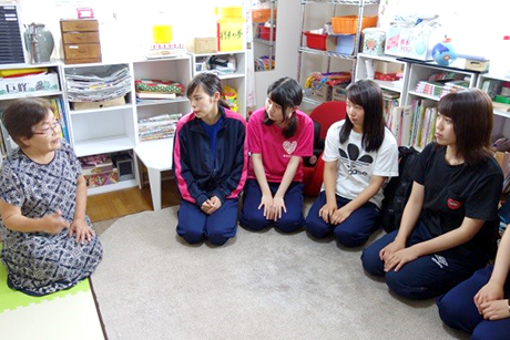 講話が終了した後は、課外の自主実習で小さな森の保育園に伺いました。到着した時には、子どもたちも午睡から目覚め始めた頃で、学生も子どもたちと一緒に手作りのおやつをいただきました。「こんなにおいしい手作りのおやつが食べられて、子どもたちは幸せですね。」と感動する学生もいました。また、「物的・人的環境ともに子どもたちがのびのびと思い思いの活動に取り組むことができるような設定はどのようなものか、実際を見学して実感することができました。」と、現場に伺うからこその学びもできたようです。