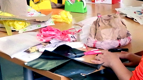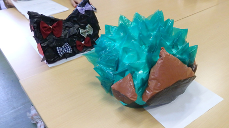 下は「保育実践講座 造形表現」の講座で、廃材を利用した「わたしの帽子づくり」の制作風景です。それぞれの先生が、今まで保育者として培ってきた技術を存分に発揮しながら、そしてとても楽しく作っておられました。