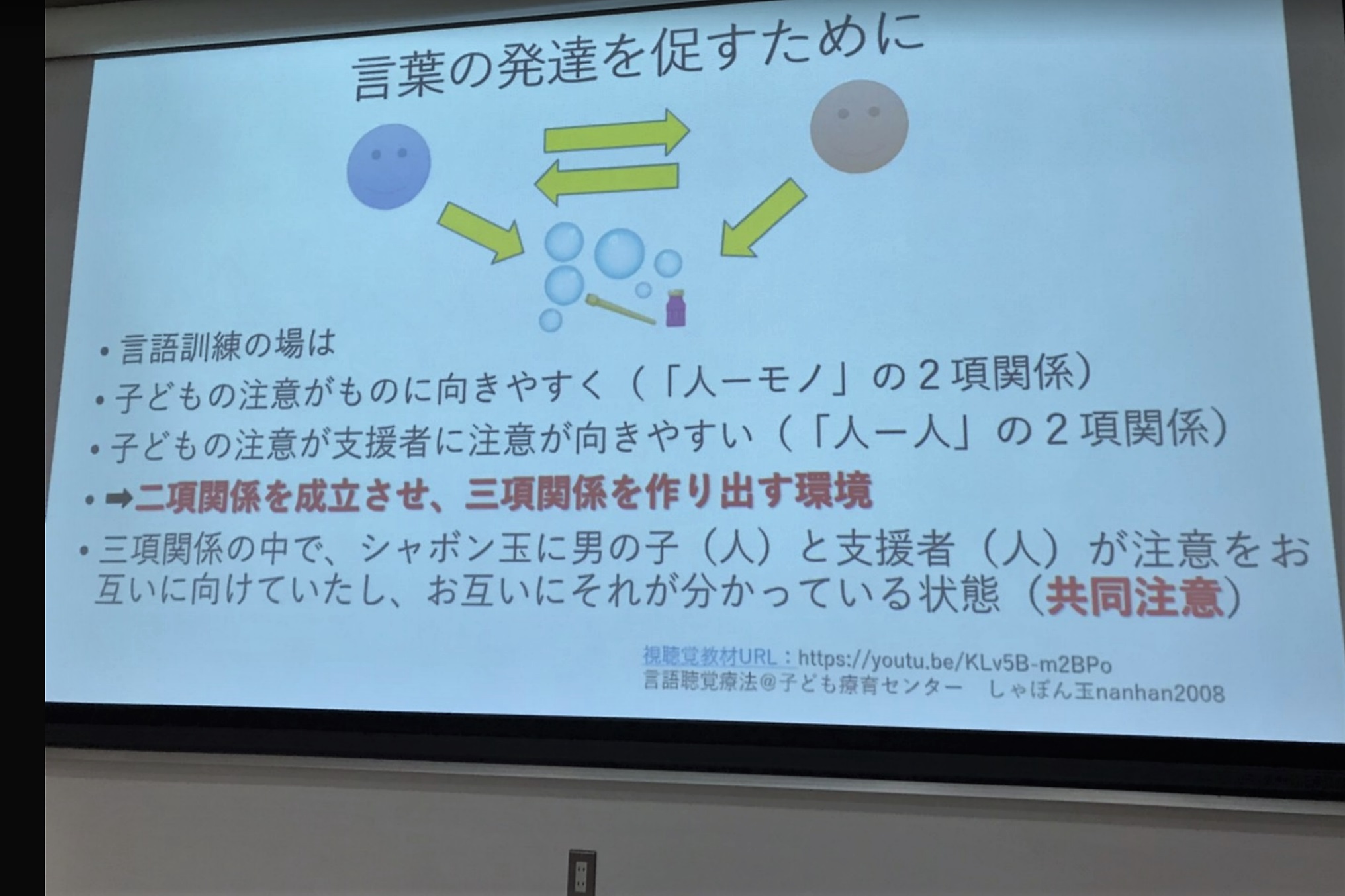 スライドは、言語障がいの子どもの中でも、発語や言葉の理解がゆっくりの子どもに向けてかかわる時のポイントを伝えています。しかし、このかかわり自体は、保育や子育ての場において、どのような子どもたちとのコミュニケーションでも、とても重要な要素です。ある側面で、障がいのある子どもへのかかわりを学ぶなかで、実は障がいのある子どもへの「特別なかかわり」ではなく、すべての子どもたちの発達を支える大事なかかわりであることがあります。障害児保育Aの受講を通じて、いろいろな子どもたちの世界に触れながら、どの子どもにとっても過ごしやすい保育の場を提供できるような保育者となってくれることを願っています。