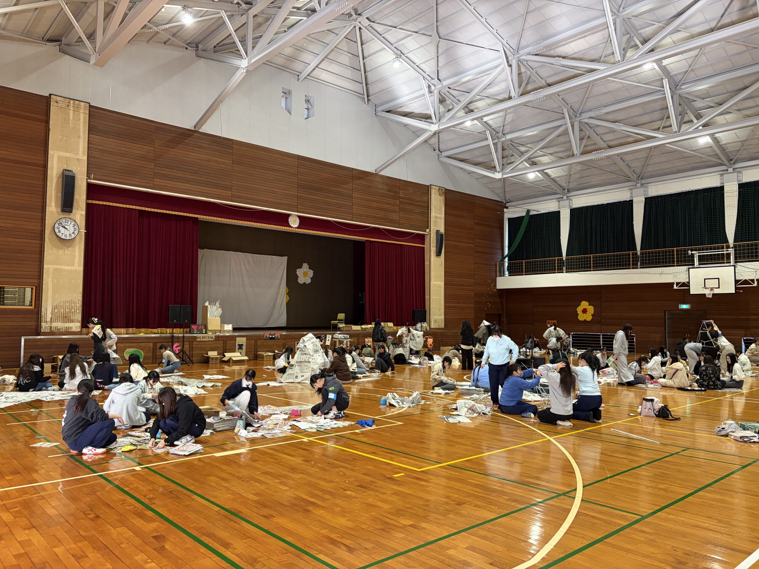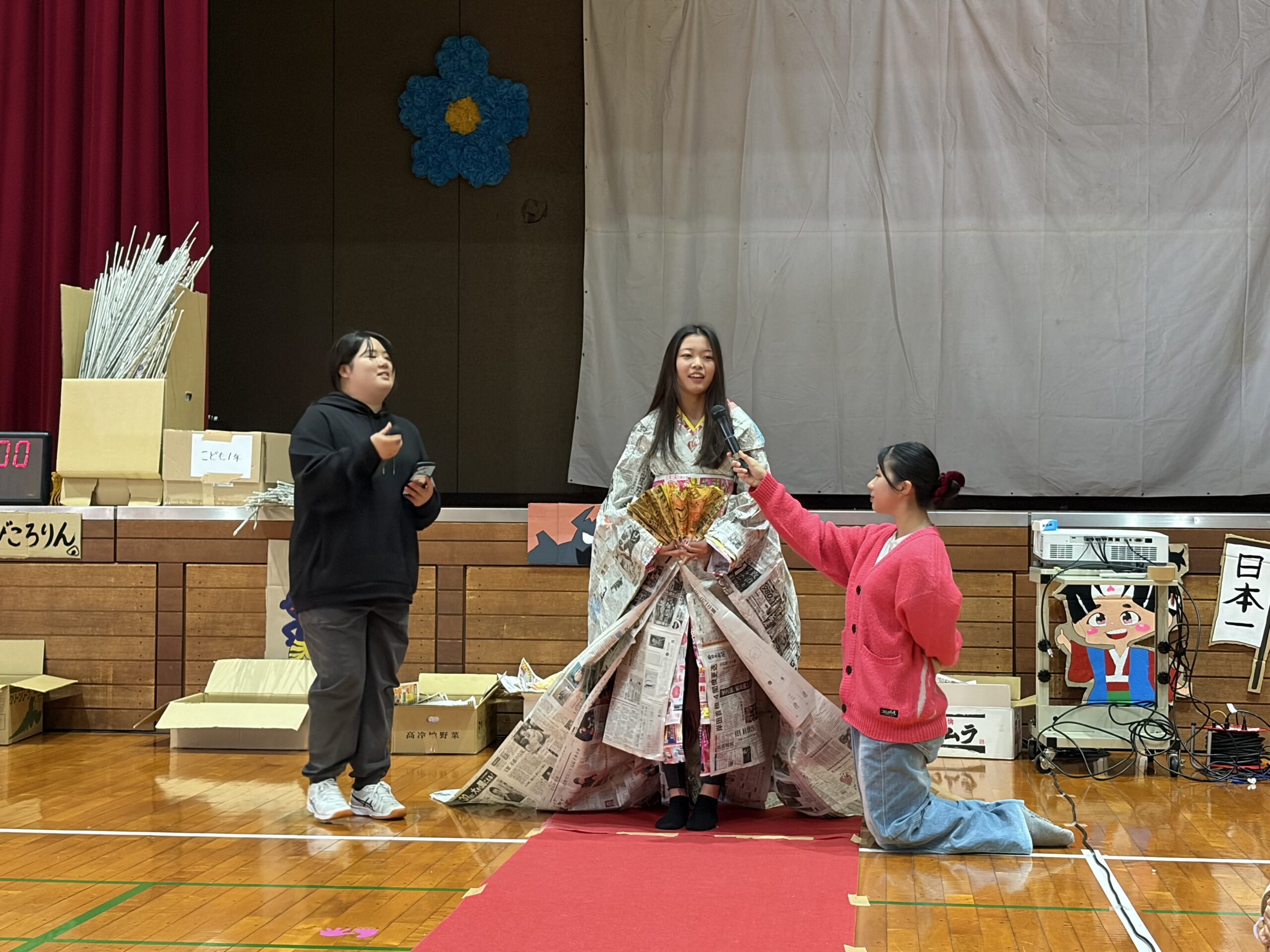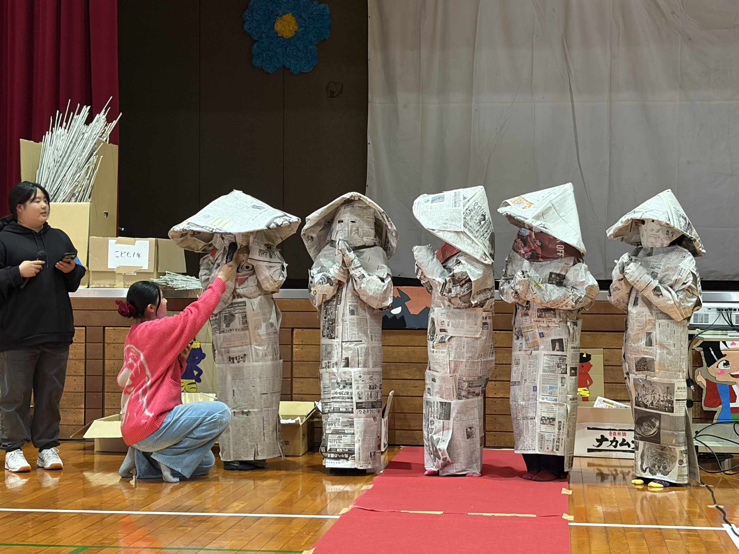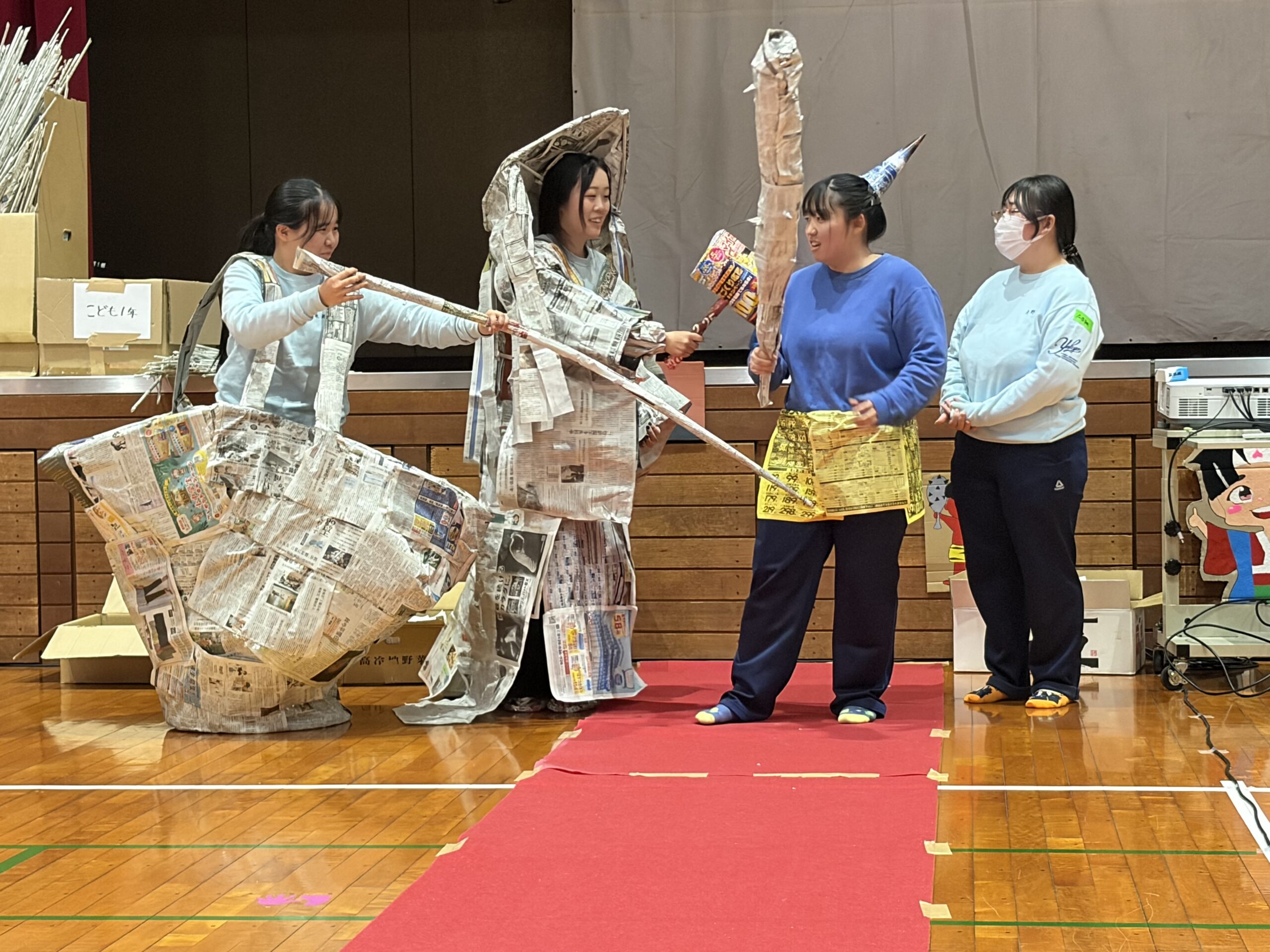 1日目のメインは、クラスごとの代表チームがテーマに沿った衣装を新聞紙でつくる「バケラッタ」です。バケラッタでは、新聞紙だけをつかってそれぞれのクラスが決めたテーマの衣装を作成します。今年のテーマは、「昔話」。クラスごとに協力して、素晴らしい衣装が出来ていました!