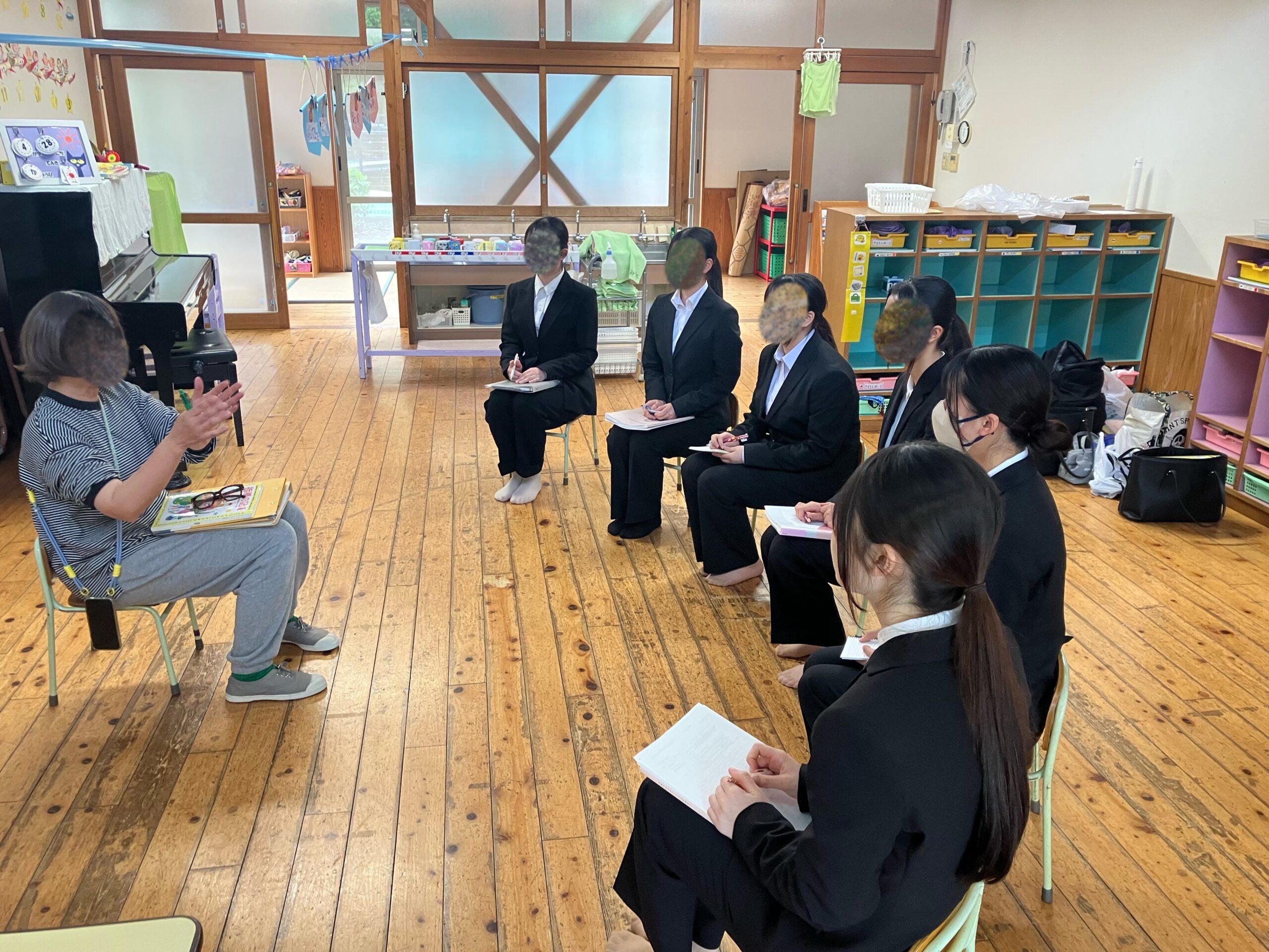 学内での事前指導では、前回のオリエンテーション内容を確認するとともに、実習中に作成する「指導計画案」や、実習後に取り組む「重点考察シート」について説明が行われました。学生たちは、実習で何を観察し、どのように学びを深めていくのかを確認しながら、自分自身の課題や実習での目標について考える時間となりました。