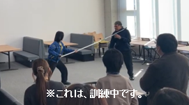 参加者からは「さすまたの使い方が理解できた」「日頃の防犯意識が高まった」といった感想が寄せられました。本学では、今回の研修成果を活かし、今後も学生が安心して学べる安全なキャンパスづくりに努めてまいります。